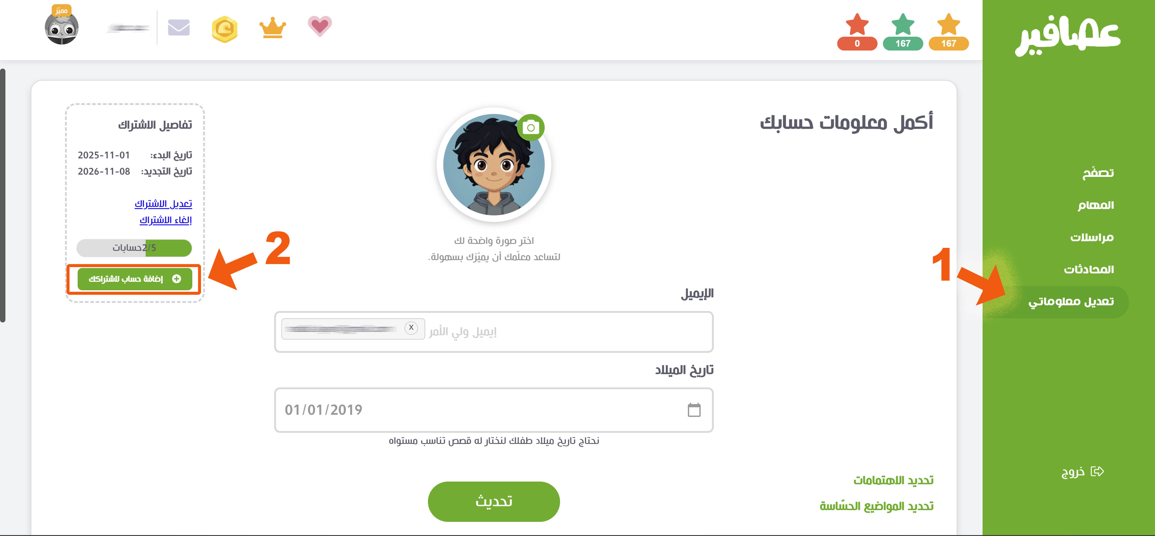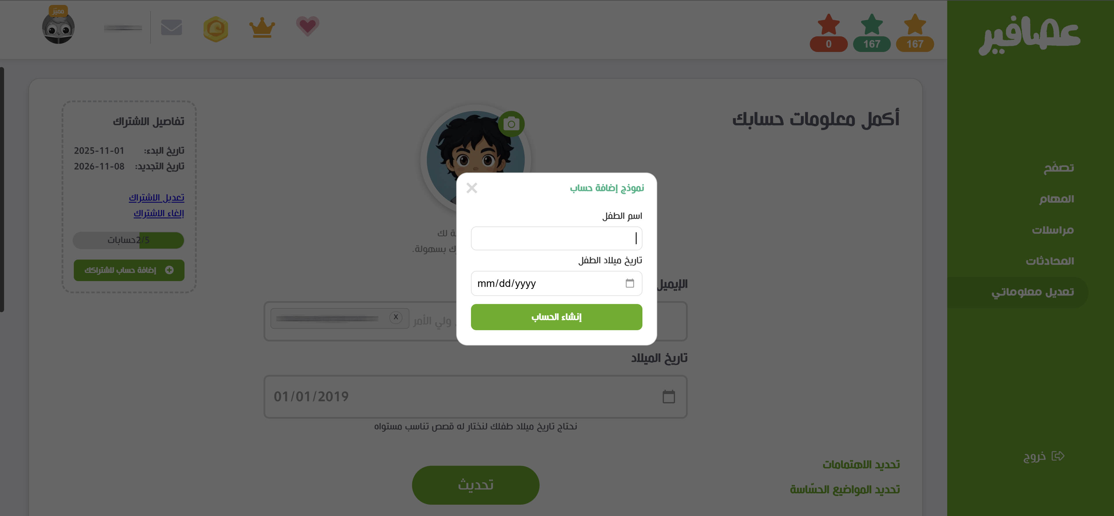| من صفحة "تعديل معلوماتي"، اضغط على زر "إضافة حساب لاشتراكك" | قم بملء اسم المتعلّم، وتاريخ ميلاده |