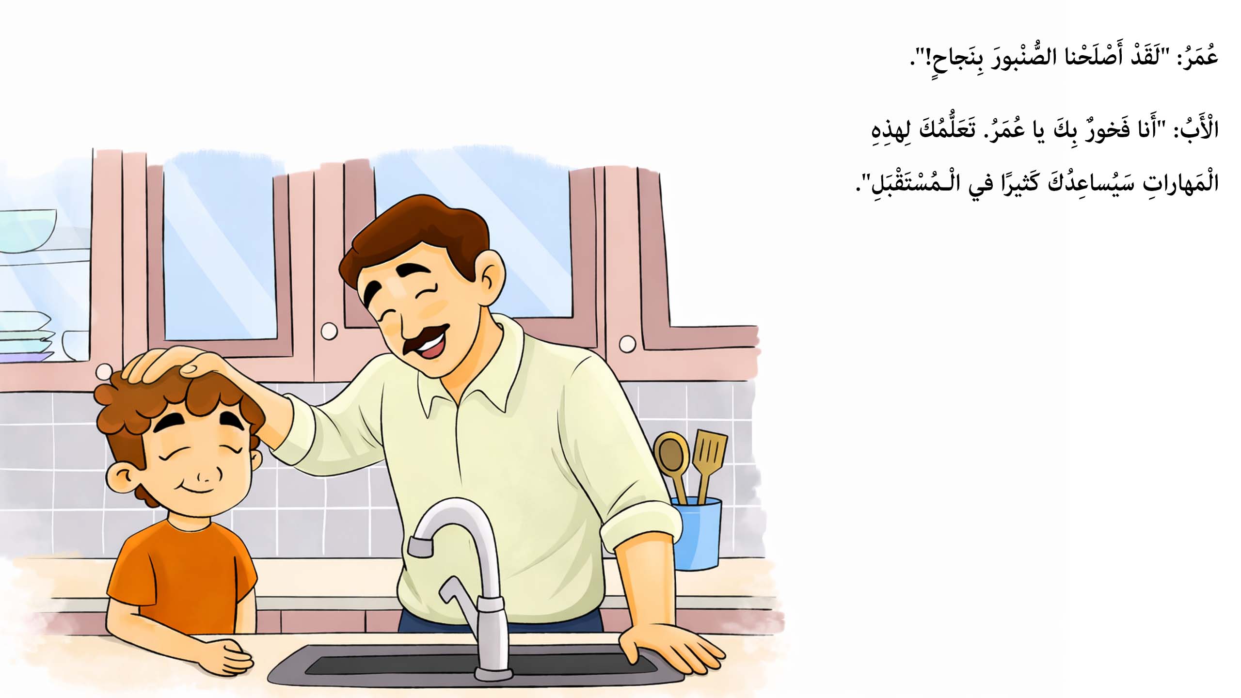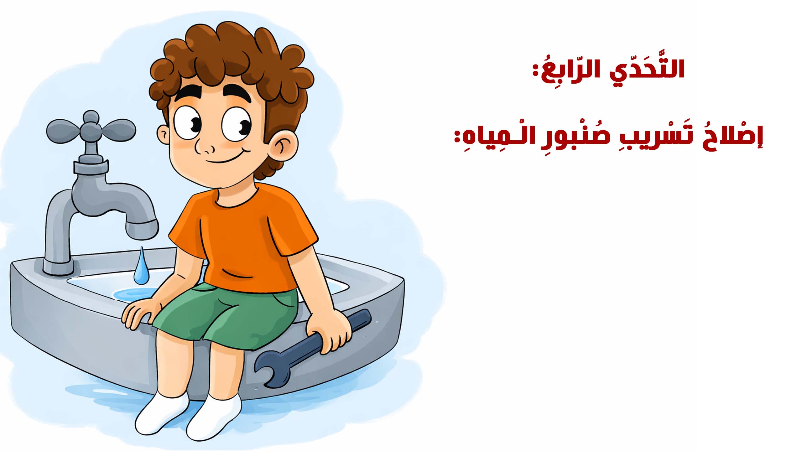 مع عمر وأبيه، يتحوّل تسريب الصنبور إلى مغامرة منزلية! تعلّم إغلاق المحبس، فكّ الصامولة، فحص الجِلدة واستعمال التيفلون—خطوات بسيطة تنهي التسرّب وتمنحك مهارة لا تُنسى.